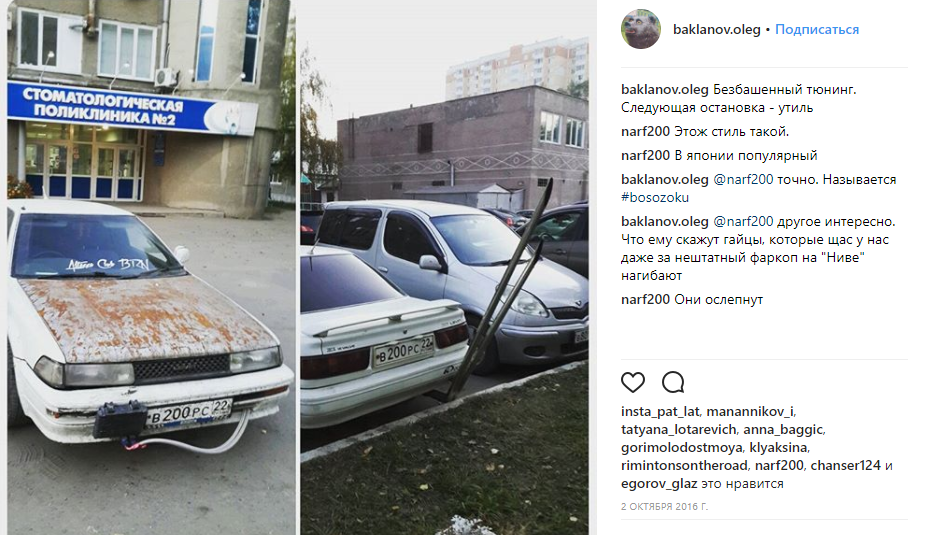 В нашей стране об этой почти исчезнувшей японской субкультуре известно немногим. Однако и на российских дорогах иногда с удивлением можно увидеть какую-нибудь старую японскую «праворульку» с выставленным на передний бампер масляным радиатором и болтающимися шлангами, а также с задранными вверх удлиненными выхлопными трубами. Под недоуменные взгляды владелец такой машины едет до встречи с ближайшим патрулем ГИБДД, который не без удовольствия выписывает штраф по «любимому» в среде поклонников автотюнинга пункту 12.5.1 КоАП РФ – за внесение изменений в конструкцию автомобиля без их регистрации.