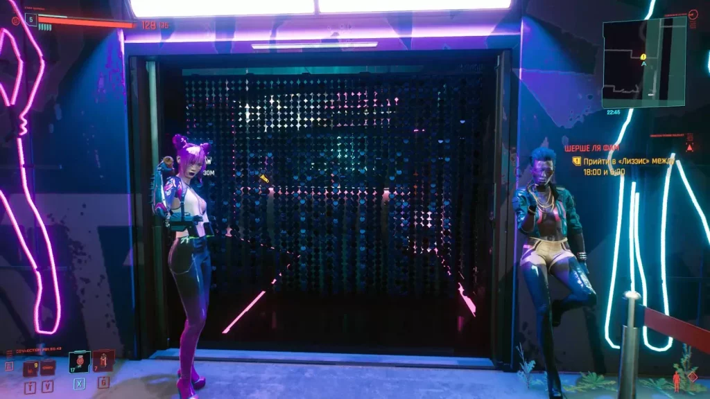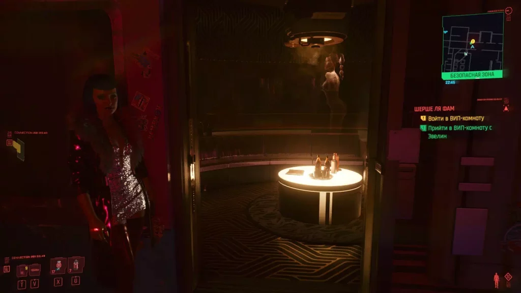 Знакомимся с Эвелин Паркер. Перекидываясь пару фраз Эвелин проводит Ви в VIP-кабинку для переговоров. Там обсуждаются детали заказа. Говорим про фиксера Декстера, биочип и собственно Еринобу Арасаки, где этот чип и находится. Эвелин записала брейнданс лично, когда была у него. Оказалось что она была его любовницей.