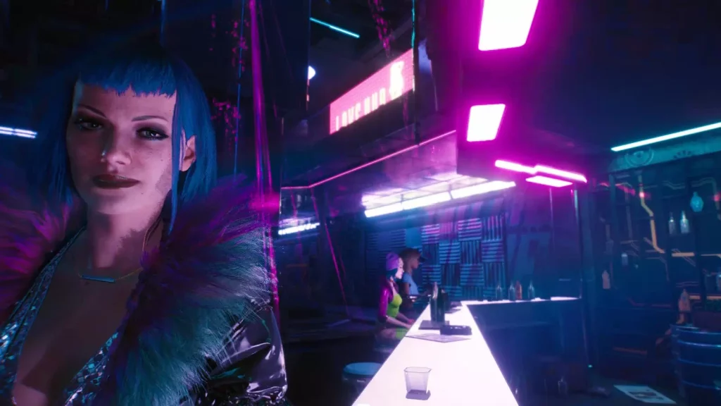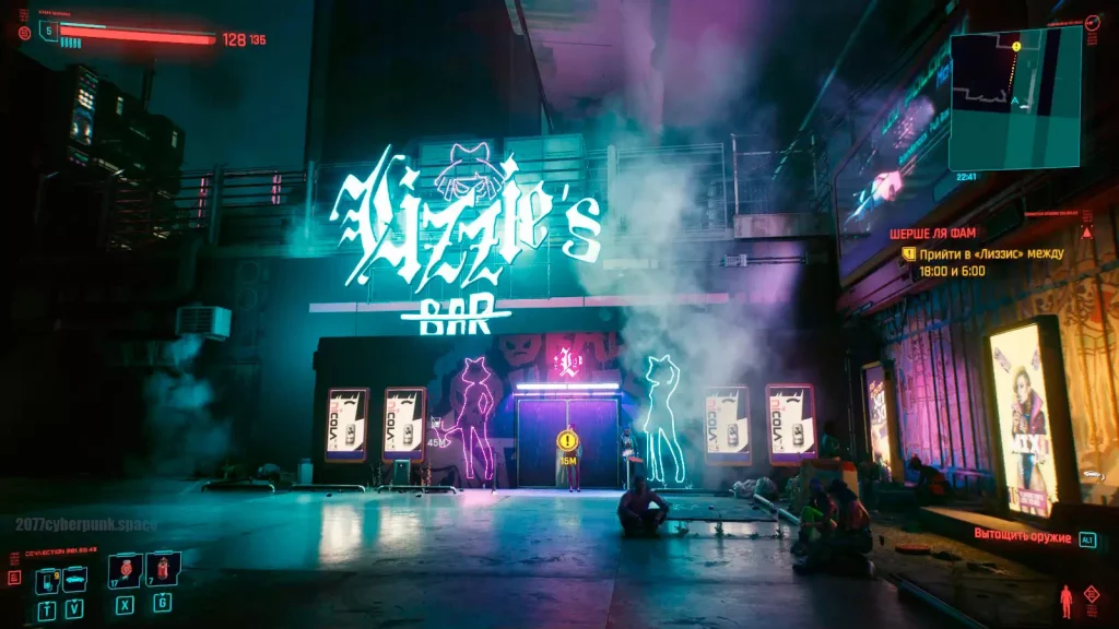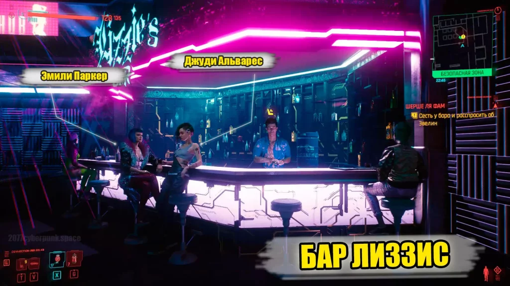 Заходим внутрь. Проходим общий зал к бармену. Рядом уже ждут Эмили с Джуди. Однако говорить сперва нужно с барменом. Спрашиваем его об Эвелин, независимо от дальнейшего диалога она сама подойдет к Ви.