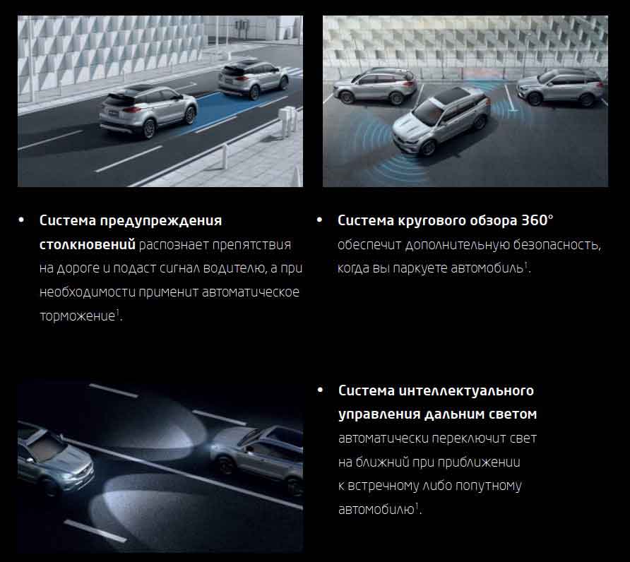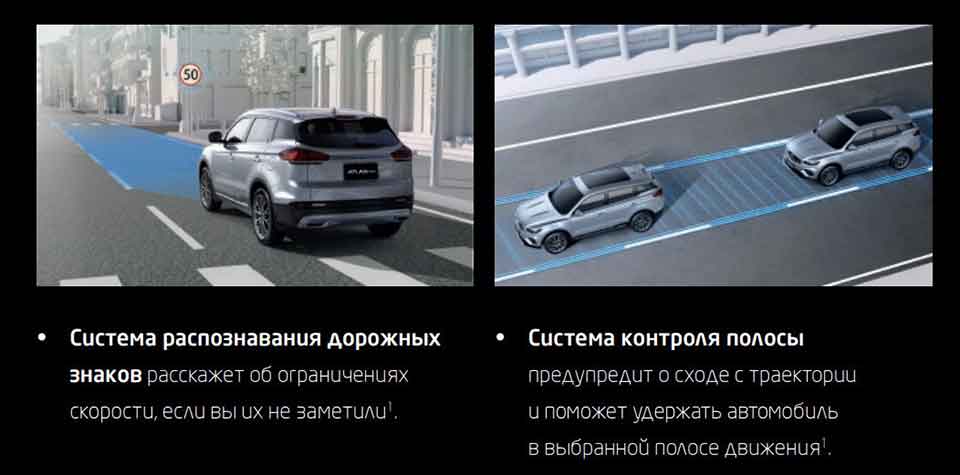 Geely Atlas Pro – это достаточно хорошо оснащенный кроссовер, уже в начальной комплектации получающий электронные системы ABS, TCS, ESC, EBD, EBA, HHC, HDC, ESS и TPMS, четыре подушки безопасности (фронтальные и боковые передние), стояночный тормоз электронного типа (EPB) с функцией Autohold.