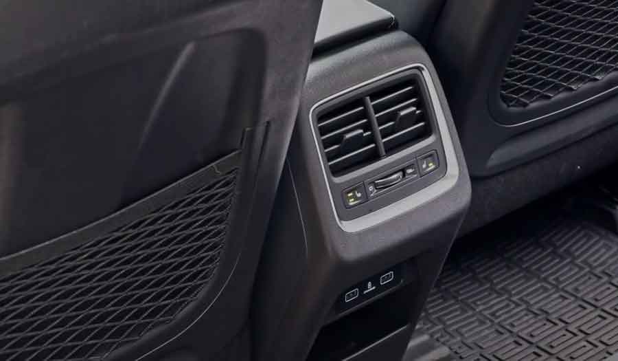 - на задней части центральной консоли предусмотрены два дефлектора обдува с регулированием воздушного потока, две кнопки двухступенчатого обогрева сидений, ниже установлено два USB-разъема для подзарядки мобильных гаджетов, в самом низу – небольшой вещевой бокс;