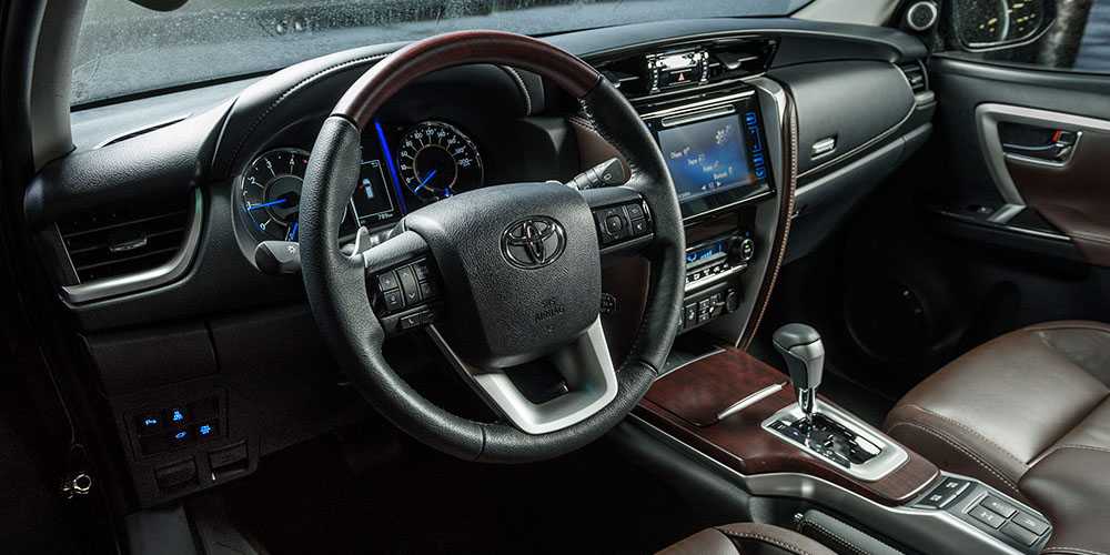 Внутри Тойота Фортунер просторный салон. Водитель и пассажиры сидят высоко, а за счёт технологии кузова «универсал» появляется багажное отделение повышенной вместимости при сложенном третьем ряде сидений. Дорожный просвет позволяет не замечать неровностей, которые для других машин стали бы преградой.