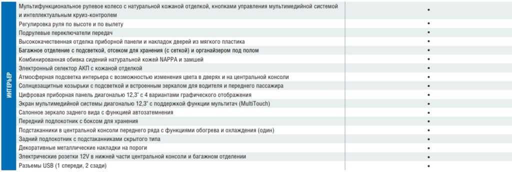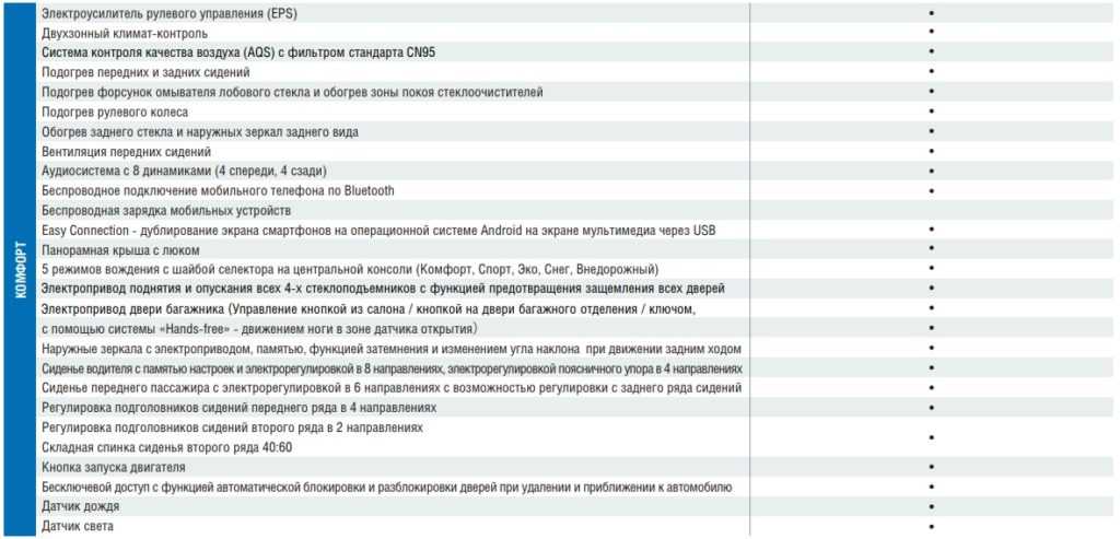 Кроме того есть подогрев форунок омывателя переднего стекла. Датчика дождя и света, электроусилитель руля. Вывод изображения с камер на экран мультимедийной системы. Помощник совершения автоматической парковки, подогрев руля и зоны покоя дворников. Система контроля качества воздуха в салоне с фильтром на входе. Обогрев зеркал, беспроводная зарядка телефонов + USB-порты для всех пассажиров. Для использования и зарядки их гаджетов.