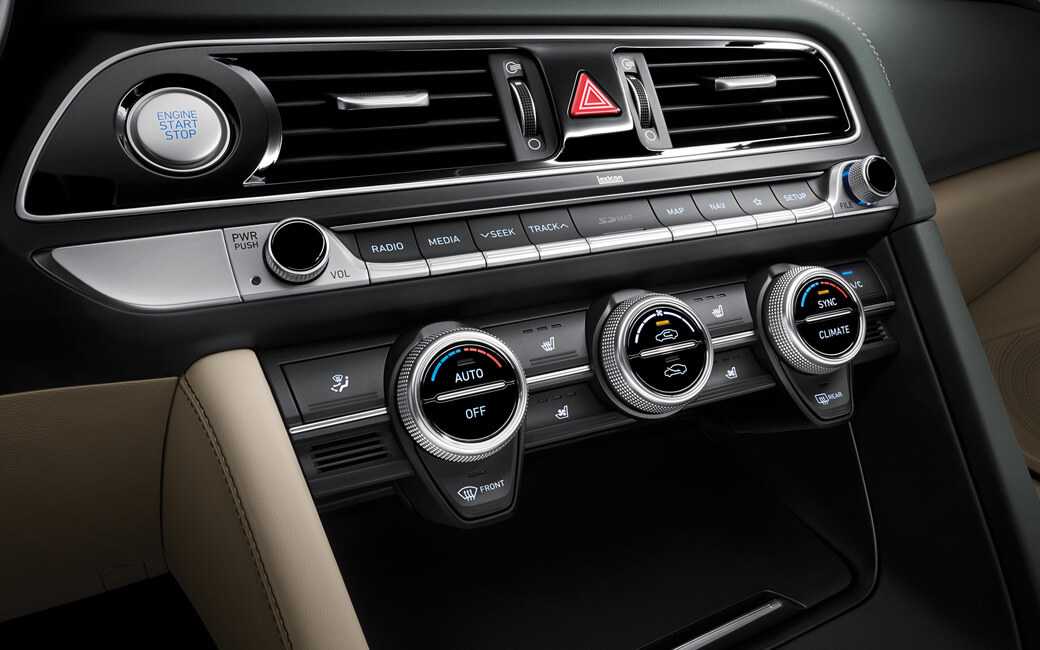 Салон Genesis G70 имеет популярный на сегодня минималистичный стиль. Стоит признать, что в этом плане корейские дизайнеры не прогадали. Внутреннее пространство люксового седана целиком и полностью изготовлено из материалов высокого качества. Интерьер обладает мягким пластиком, натуральной и эко-кожей Nappa, а также декоративными вставками из шлифованного металла. Для покупателей корейцы предусмотрели 5 базовых цветовых решения отделки салона. Кроме этого, есть 2 эксклюзивных вариаций, что позволяет настроить интерьер по своему предпочтению.