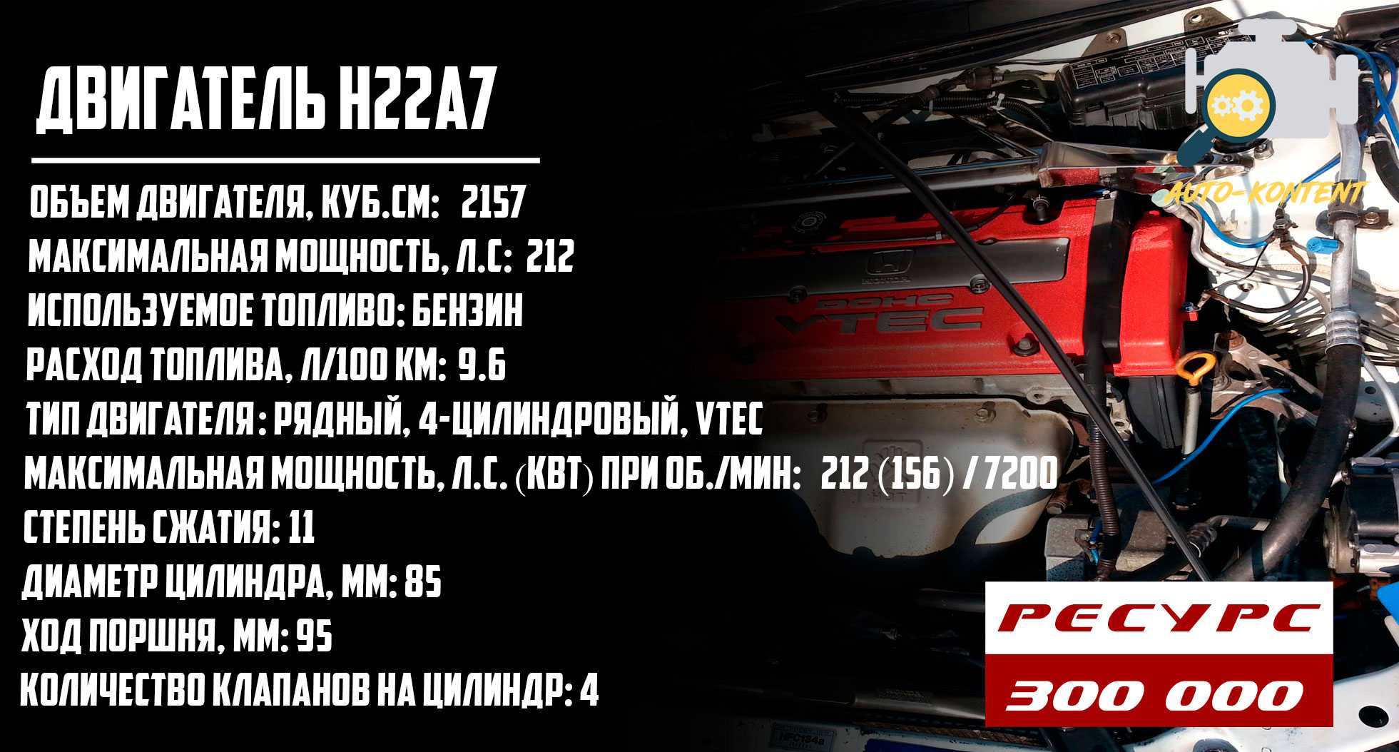 В 1991 году компания Honda начала производство спортивной версии силовых агрегатов, получившую маркировку H. Семейство включает в себя движки H22 и H23 и все многочисленные модификации. В 2001 году на седан Honda Accord 6 поставили мотор H22A7 – силовой агрегат для европейского рынка. Это рядный четырехцилиндровый движок с системой VTEC. Агрегат получил алюминиевый блок цилиндров с покрытыми FRM стенками. Высота блока составляет 219.5 мм, до 1997 года все установки H22A имели закрытый блок, а произведенные в период с 1997 по 2001 год – открытый. Внутри блока цилиндров помещен коленчатый вал с ходом поршня 95 мм, цилиндры расточены под 85 мм. Конфигурация наделяет H22A7 рабочим объемом в 2157 куб. см. Головка блока 16-клапанная с двумя распределительными валами DOHC. По своей конструкции H22A7 сильно напоминает H22A Red Top от Euro R,но в первом другой выпускной коллектор. К тому же здесь лучше реализована система продувки.