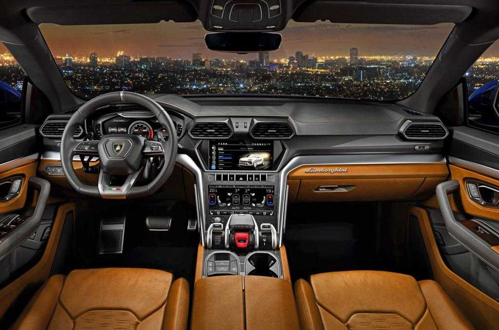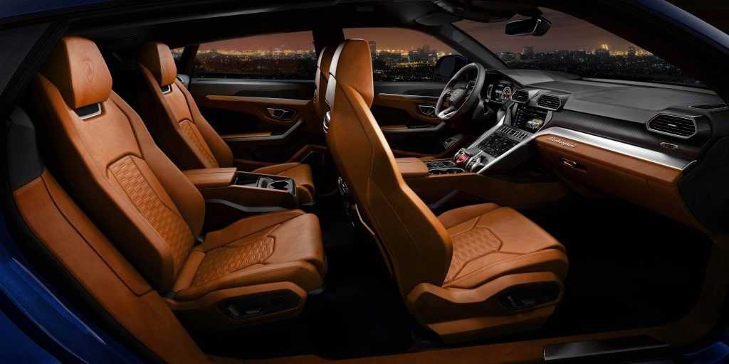 Салон Lamborghini Urus оформлен в стиле «итальянских быков», все так же напоминает место пилота космического корабля, но в кроссовере он более сдержанный. Однако внедорожник не лишен фирменных фишек в виде кнопки запуска на центральном тоннеле, которая находится под красной крышкой. Вокруг нее размещены элементы управления коробкой передач. В верхней части центральной консоли располагается два дисплея с сенсорным управлением, которые включают функцию для распознавания рукописного ввода. Один из них отвечает за информационно-развлекательную систему, второй – за климат-контроль. Еще один дисплей установлен на месте приборной панели.