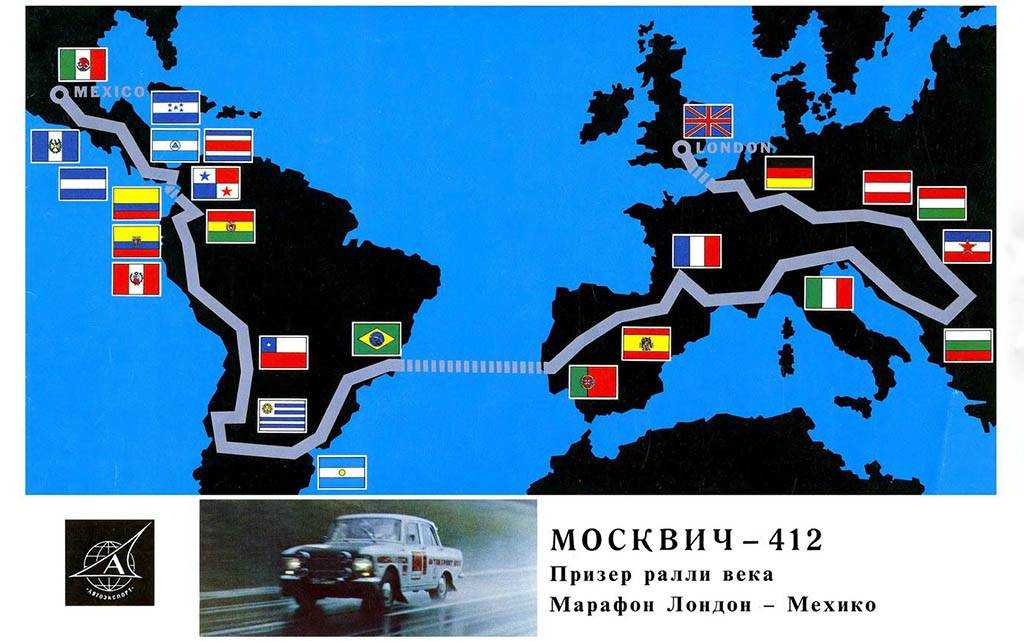 Случилось это в 1968-м. А поскольку гонка изрядно нашумела в зарубежных автомобильных кругах, ралли-марафон решили повторить в 1970-м, приурочив к старту чемпионата мира по футболу. Да не просто повторить, а с еще большим размахом. Лондон — Мехико, 26 000 км, 25 стран, 39 дней…Но чем убойнее дистанция, тем выше результат. «Москвичи-412» взяли 2 и 3 места в своем классе и обеспечили бронзу советской команде. Две из пяти машин мы потеряли, но это был лучший показатель надежности. Сравните: Porsche вообще не увидели финиша, доехал один из пяти «Мерседесов», единственный Citroen из шести, одинокий Peugeot из 12…
