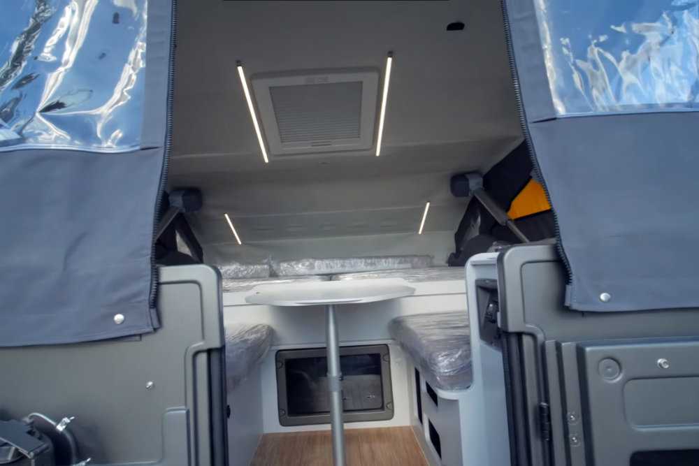 Благодаря мощным приводам съёмный жилой модуль за 22 секунды трансформируется в некую автопалатку. Снаружи надстройка имеет различные ниши, 20-литровую канистру для отопителя. К слову, модуль снимается с грузовой платформы машины за счёт двух домкратов.