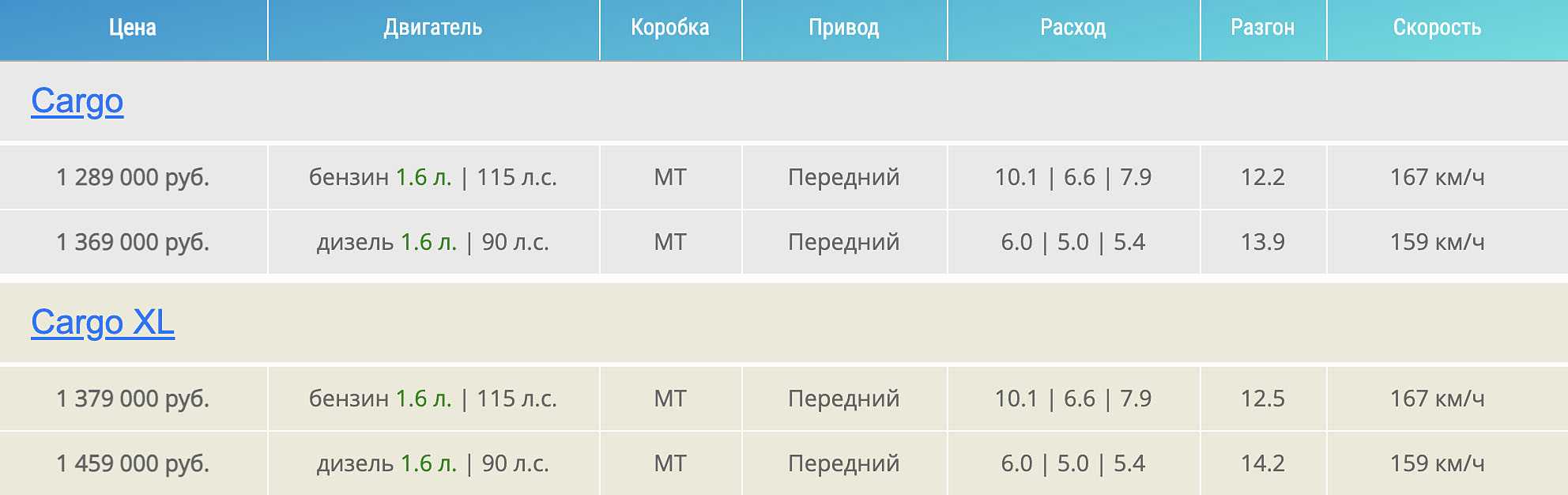 - Cargo XL с дизельным ДВС и МКПП. Стартует комплектация от 1,379 миллиона рублей.