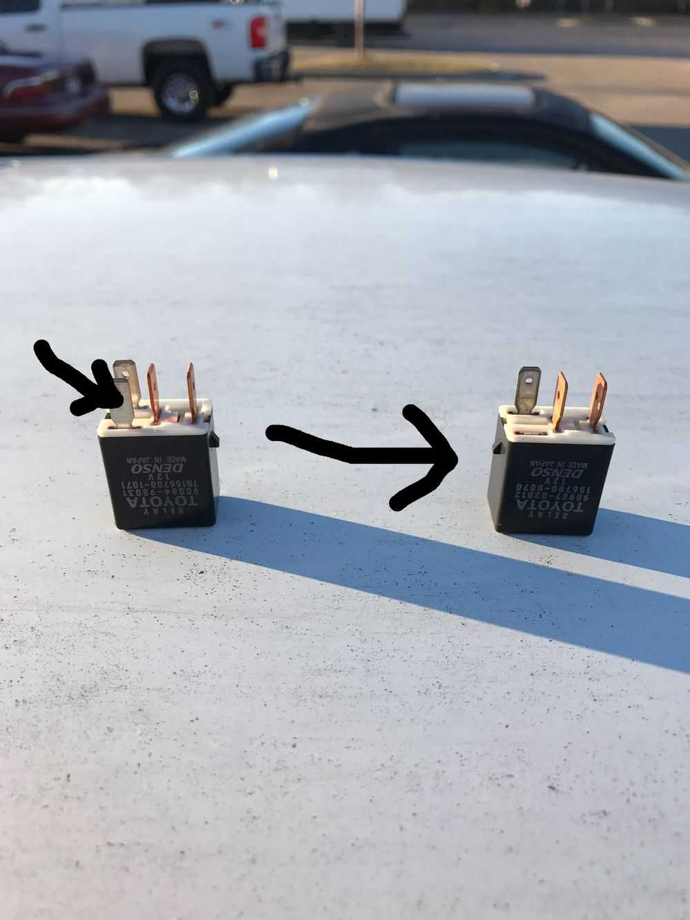Теперь пришло время испортить рабочее реле топливного насоса, удалив с него одну «ножку», по которой как раз и поступает питание. Для этого нужно просто отломать именно ту «ножку» реле, которая вставляется в контакт питания, определенный нами с помощью индикаторной отвертки.