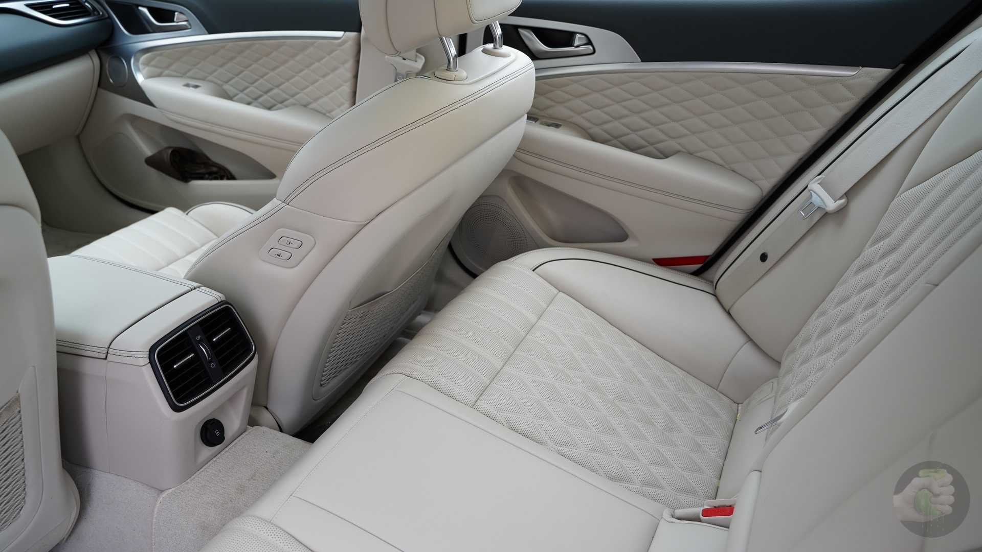 Задняя часть Дженезис G70 2020 может похвастаться спортивным диффузором с двумя патрубками выпускной системы, а также оригинальными габаритными огнями и стильной крышкой багажного отделения. Корма люксового седана тоже похожа своими фонарями на стиль Mercedes. Крышка багажного отделения по некоторым причинам была задрана высокой для придания машине некой мукулистости и купеообразности, ведь это как ни как собрат KIA Stinger.