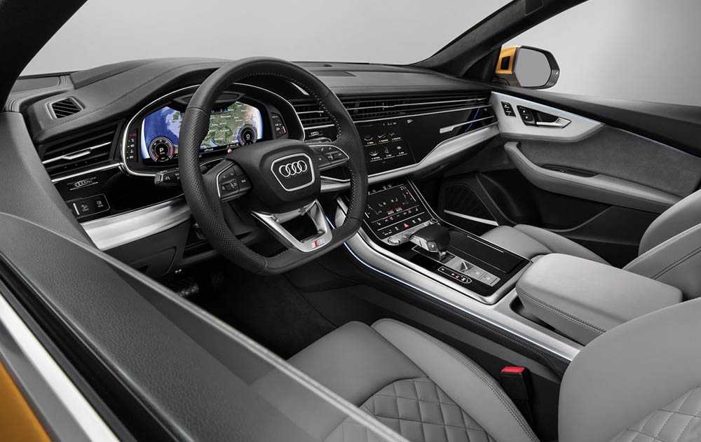 Несмотря на то, что новый внедорожник менее длинный, чем Ку7, его салон поражает габаритами. Все дело в том, что у этого авто нет третьего ряда сидений, а благодаря ширине в 2 метра создается впечатление просто огромного внутреннего пространства. Передние кресла не только не соприкасаются друг с другом, а находятся даже на неком отдалении. Благодаря таким размерам даже широкие передние стойки не скрадывают обзорность лобового стекла. Задний же пассажирский ряд рассчитан на три полноценных места. По внутренними параметрам Audi Q8 2018 превосходит своих прямых конкурентов BMW X6 и Mercedes GLE Coupe.
