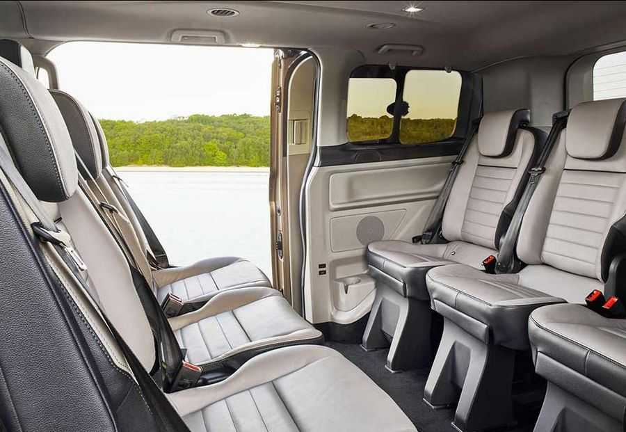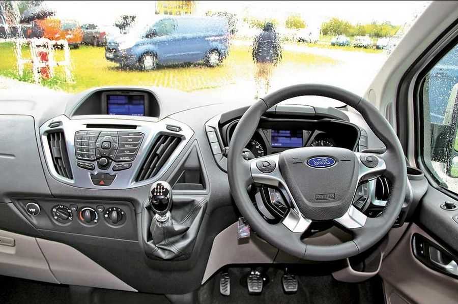 Компания Ford не упускает возможности подчеркнуть качество и комфорт интерьера нового Tourneo Custom. Надо сказать, что в обоих аспектах автомобиль действительно превосходит большинство представителей сегмента. Водители, которые успели побывать за рулем Focus или Mondeo, будут чувствовать себя в Tourneo как дома, так как приборная панель почти идентична. Качество отделочных материалов выше, чем в среднем по классу, кроме того, они очень выносливые. Такое качество не абы как порадует водителей, которые планируют использовать автомобиль для коммерческой перевозки пассажиров. Внутри Custom находиться приятно. Водитель сможет оценить высокий уровень комфорта, благодаря тихому салону, надежному сидению и настройкам рулевого колеса и колонки. Фронтальная видимость хорошая, при парковке задним ходом, между тем, водителю придется положиться на большие боковые зеркала. Для помощи водителю предусмотрено немало средств, включая систему соблюдения полосы движения. Для личных вещей в передней части размещено немало удобных отсеков. В зависимости от потребностей водитель выбирает версию на восемь или девять мест. В любой из них пассажиры смогут насладиться удобными сиденьями и личным пространством. По желанию салон можно отделать кожей. Несмотря на то, что Tourneo Custom — это пассажирский автомобиль, Ford наделила его немалой грузоподъемностью. Версия с короткой колесной базой, 4.9 метра в длину, предлагает 922 литров грузового пространства до линии остекления с разложенными задними сиденьями. Версия с длинной колесной базой, 5.34 метров в длину, вмещает 1.447 литров. Водителям, которые планируют постоянно перевозить значительное количество груза, стоит выбрать версию с длинной колесной базой. Боковые раздвижные двери и пороги облегчают процессы посадки и высадки из автомобиля. Обе передние двери имеют значительный радиус открывания. Два ряда задних сидений складываются и удаляются. Хотя водителю следует быть готовым к тому, что сиденья тяжелые и сам он не справится с их удалением. Они не складываются в уровень с полом, хотя длинные вещи перевозить вдоль салона возможно. Как в случае с Transit Custom, доступен багажник на крыше. Его грузоподъемность ограничивается 130 кг. За отдельную плату доступны задние откидные сиденья с подлокотниками.