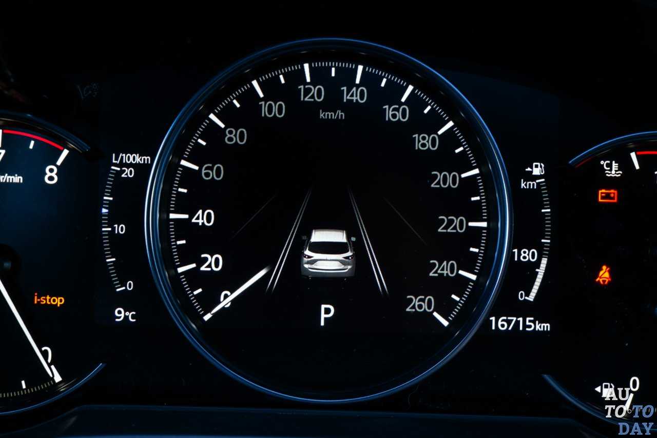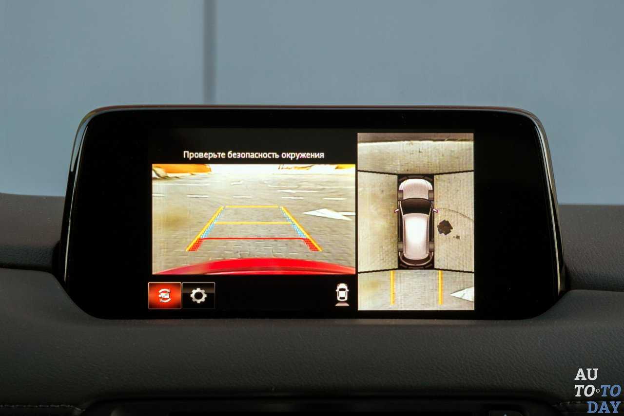 А еще огромные черные не функциональные окна – ну зачем вы тратите и так дефицитное место на этом небольшом экране? Радует лишь возможность переключать варианты обзора с разных камер: картинка с передней или задней камеры растягивается во весь размер дисплея. Но почему он остался 7-дюймовым, когда для Mazda6 используется 8-дюймовый, что удобнее при необходимости показать общую картинку кругового обзора? И раз уж вспомнили «шестерку», то вспомню и замечание к 7-дюймовому дисплею в комбинации приборов: его функциональность ушла недалеко от обычного маленького экрана бортового компьютера – к примеру, здесь явно недостает навигационной карты, подсказки навигации можно видеть только в виде проекции на лобовое стекло.