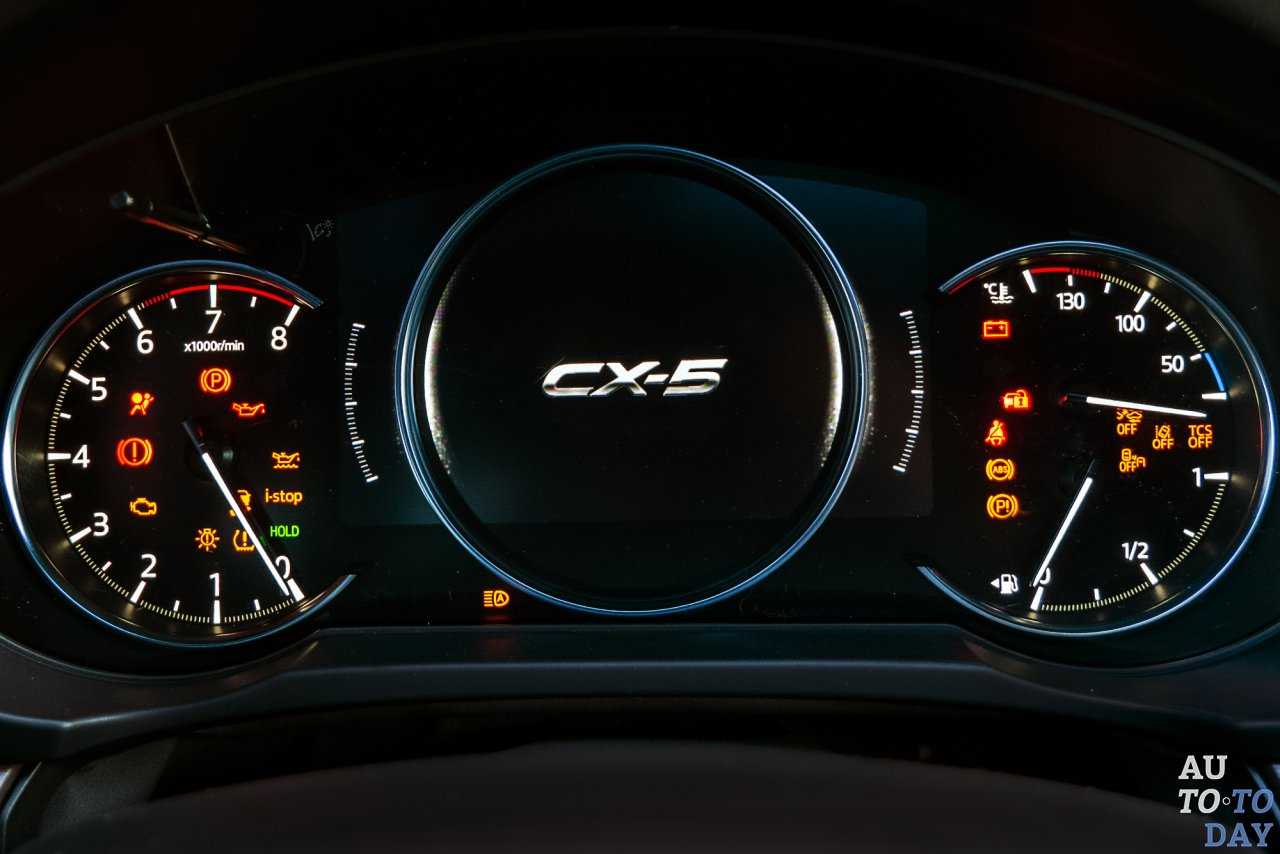Mazda не спешит полностью погружать интерьер своего кроссовера в диджитализацию, проводя этот процесс постепенно. Действительно, обновленный кроссовер CX-5 получил цветной 7-дюймовый дисплей на щитке приборов. Его главная роль – индикация спидометра и статуса работы систем активной безопасности. Но никаких тебе карт, или красочных информационных сообщений. Правда, к шрифту и скорости работы никаких претензий. Схожую комбинацию мы уже встречали на новой Mazda 3. Интересно, что часть приборов, а именно указатели уровня топлива и температуры, стали снова аналоговыми. Уверен, что такой шаг вызван неидеальной информативностью тонких цифровых шкал.