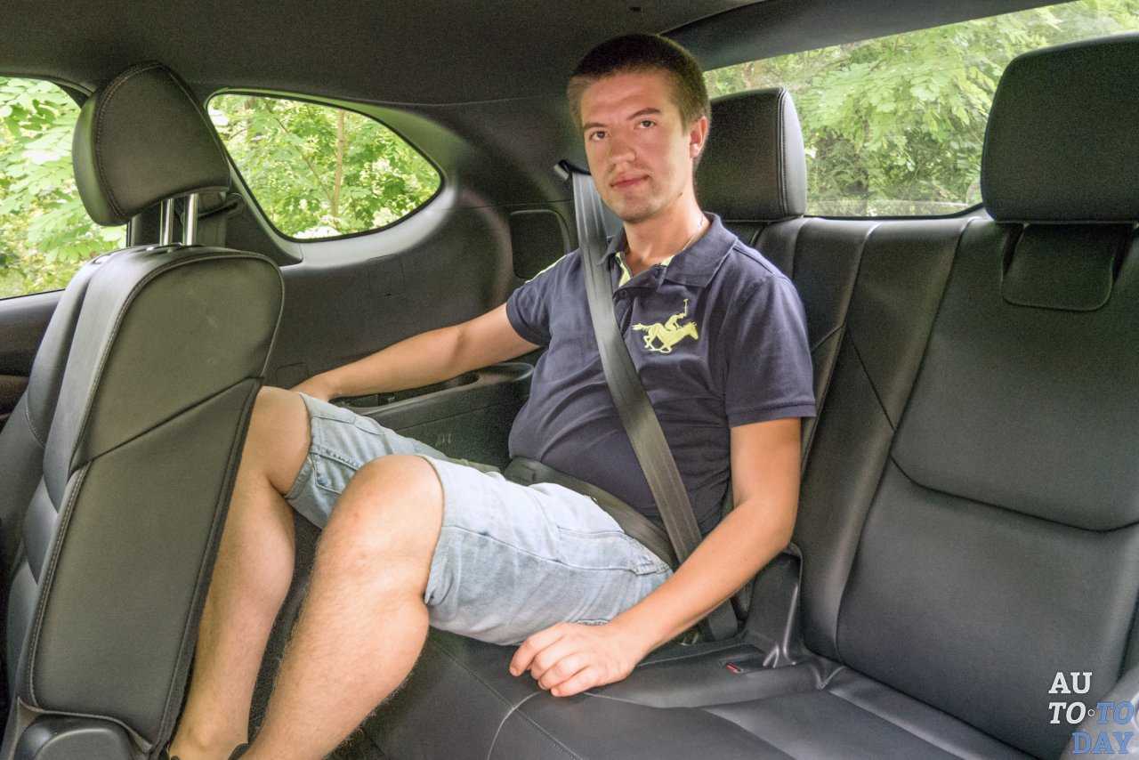 Задняя часть салона просторна: масса места по ширине (вполне могут сесть трое людей), огромный запас по высоте для голов даже самых высоких пассажиров. Есть регулировки задних сидений продольно (вперед/назад) и по углу наклона спинки.