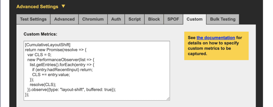 Что такое CLS – Cumulative Layout Shift Пользовательские метрики — это вставки JavaScript, которые выполняются по мере завершения тестирования веб-страницы. Синтаксис заключается в том, чтобы дать ему имя в формате  в первой строке, за которым следует сценарий с одним возвращаемым значением. Вот пользовательская метрика для измерения CLS: