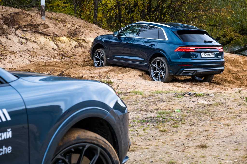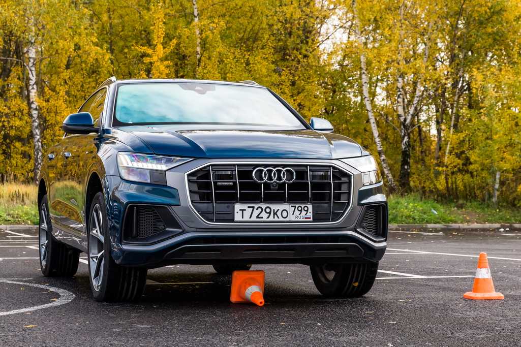 Обе машины имеют пневмоподвеску. В стандартном положении у Ауди 210 мм, Как всегда, стандартная покрышка. Начинаем. Q8 легко преодолевает двухсотмиллиметровую покрышку. Задираем максимально высоко – теперь препятствие – конус. Легко, со свистом, конус проходит под поднятой машиной.