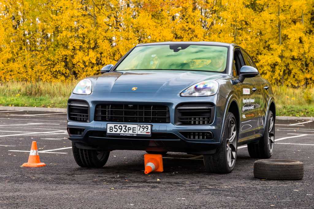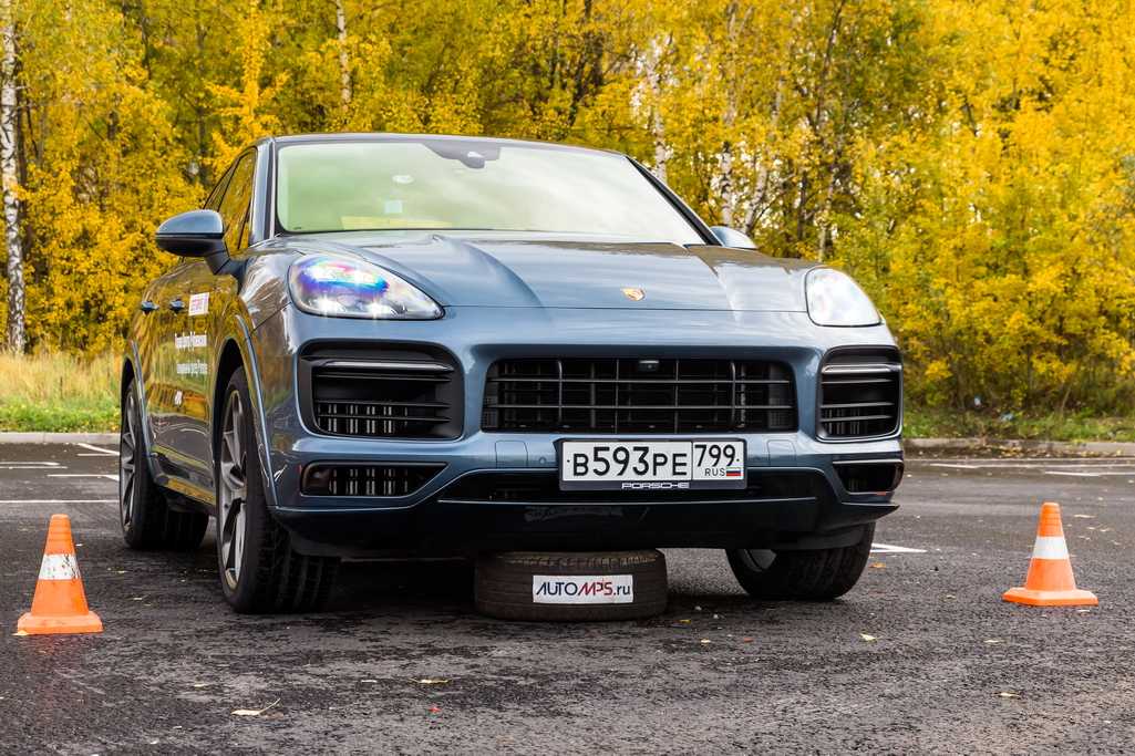 Кайен купе — короткие свесы – это хорошо. А вот клиренс в нормальном положении не велик 190 миллиметров. Кайен накрывает покрышку собой, цепляет и сдвигает. Вторая часть упражнения на полностью поднятой подвеске проходит успешно. Конус мы проехали, не зацепив его.