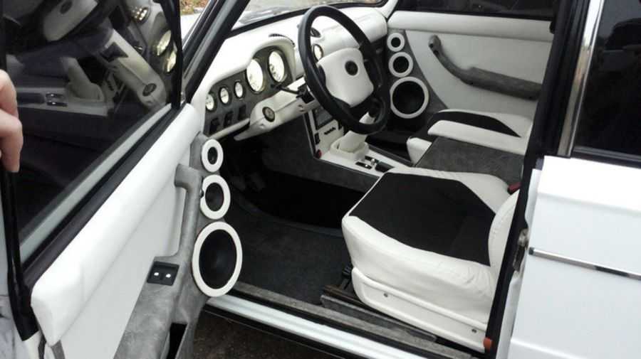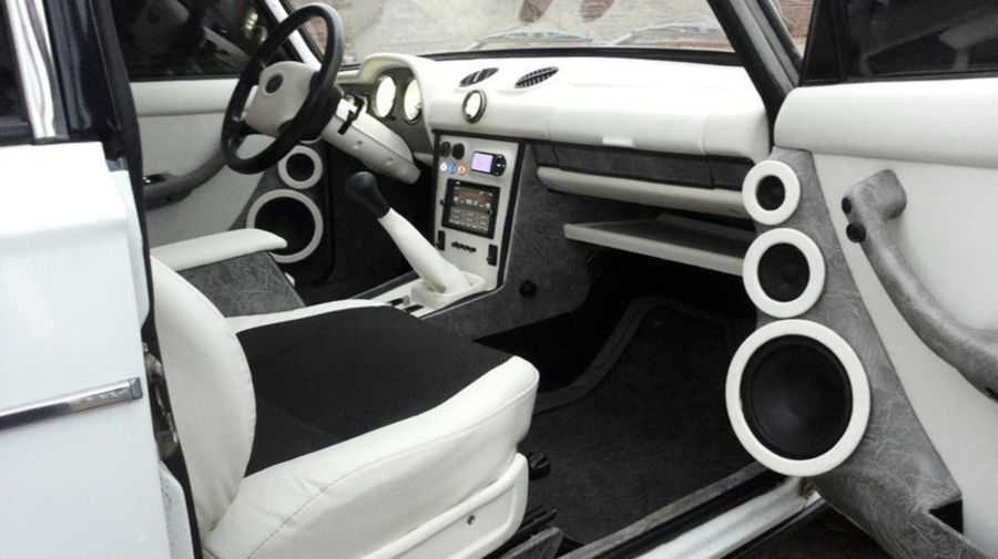 Но если открыть дверь, то взору откроется удивительной красоты и стильности черно-белый салон. Необычно размещены гирлянды динамиков на дверях, что говорит о качественном аудио-наборе этого проекта.