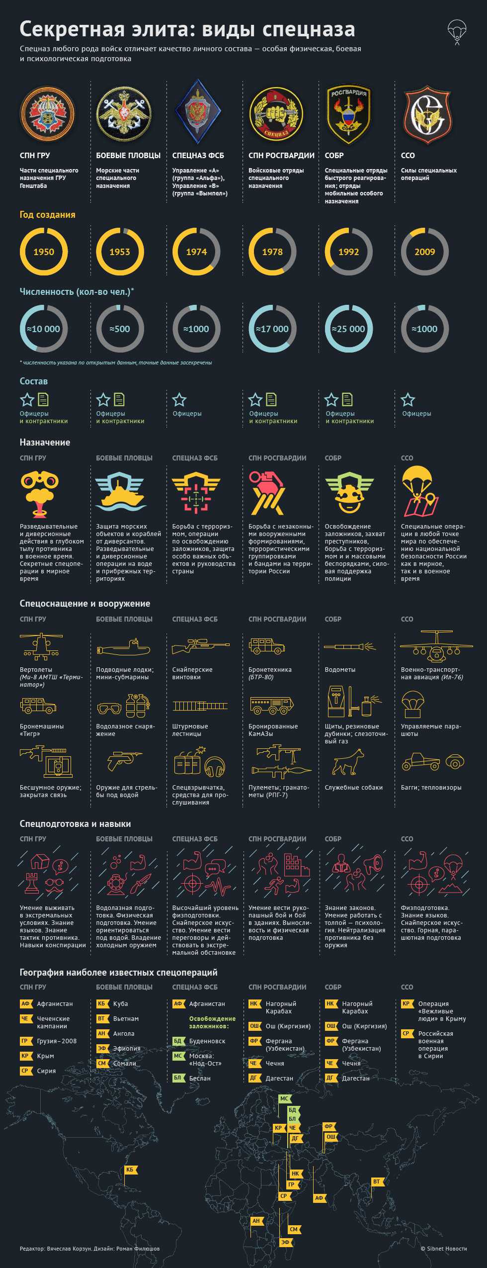 Спецназов у нас — хоть отбавляй. Особые подразделения существуют в ГРУ и ВДВ, есть отряды специального назначения в РВСН, занимающиеся охраной стартовых площадок ракет стратегического назначения. Есть спецназ ФСБ, МВД и Росгвардии, даже ФСИН (Федеральная служба исполнения наказаний) обзавелась подобными подразделениями. Ни в коей мере не умаляя достоинств этих структур специального назначения, которые имеют свою богатую историю, насыщенную уникальными боевыми операциями, новое формирование занимает в этом списке особое место по своему предназначению и применению. Уникальность Сил специальных операций России заключается еще и в том, что при выполнении определенных задач, помимо штатных подразделений, в их состав могут включаться как все вышеперечисленные спецназы, так и обычные армейские подразделения.