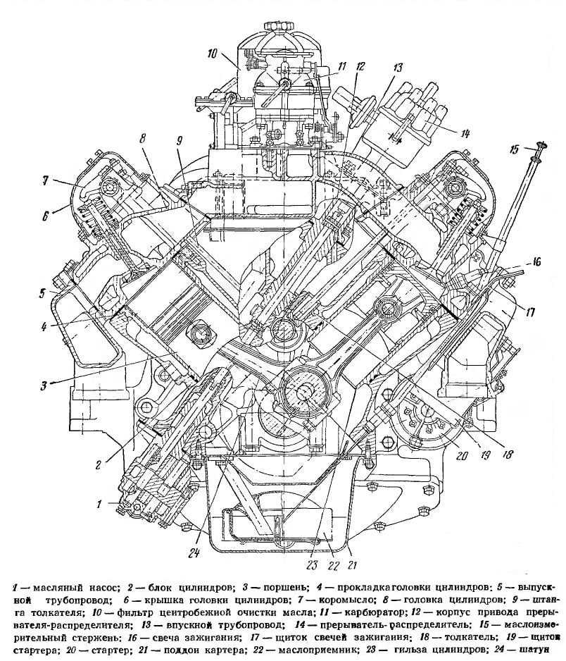 Двигатель ЗИЛ-375, V-образный, четырехтактный, карбюраторный, верхнеклапанный. Блок цилиндров — чугунный с легкосъемными вставными мокрыми гильзами и резиновыми кольцами. Гильза с кислотоупорной вставкой в верхней части. Головки блока цилиндров — две алюминиевые со вставными седлами и направляющими клапанов. Поршни — алюминиевые. Поршневые кольца — три компрессионных чугунных (два верхних — хромированные) и одно маслосъемное стальное, составное. Поршневые пальцы — стальные, плавающие, пустотелые. Шатуны — стальные, двутаврового сечения, со смазкой поршневого пальца разбрызгиванием; верхняя головка имеет бронзовую втулку. Подшипники шатунные