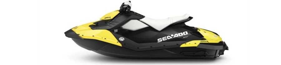 - Sea doo Spark 2 UP Rotax 900 H.O. ACE. Прогулочный гидроцикл, облегченная экономичная модель для 2 человек. Мощность двигателя 90 л. с., объем бака для топлива 30 л. Сиденье удобное, но без регулятора по высоте. Модель проста в управлении, стандартный аварийный выключатель двигателя в наличии. Имеются поручни для пассажира и удобные подножки. Цена от 700 тыс. рублей.