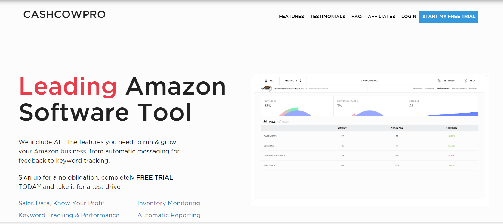 CashCowPro — это полный инструмент управления Amazon, который предлагает инструменты и функции для автоматического обмена сообщениями, отслеживания ключевых слов, отслеживания данных в реальном времени и многого другого. CCP предоставляет огромное количество данных, чтобы вы могли обнаружить и проанализировать всю вашу стратегию Amazon.
