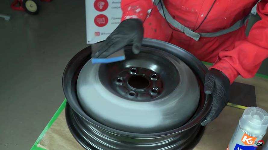 После высыхания грунта губкой синего цвета тщательно матируем весь диск автомобиля, уделяя особое внимание зоне контакта диска с резиной