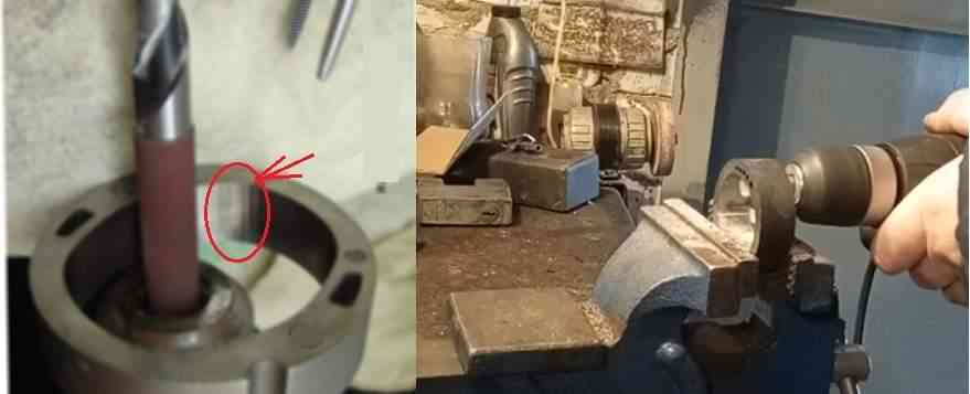 Она имеет овальную форму. Со временем на её поверхности появляется выработка в виде ступеньки. Для устранения дефекта берем наждачную бумагу с зернистостью 1000, самое толстое сверло и дрель. На гладкую часть сверла наматываем наждачку, оставляя место для крепления дрели. Вставляем и небольшими оборотами шлифуем видимый дефект обоймы.