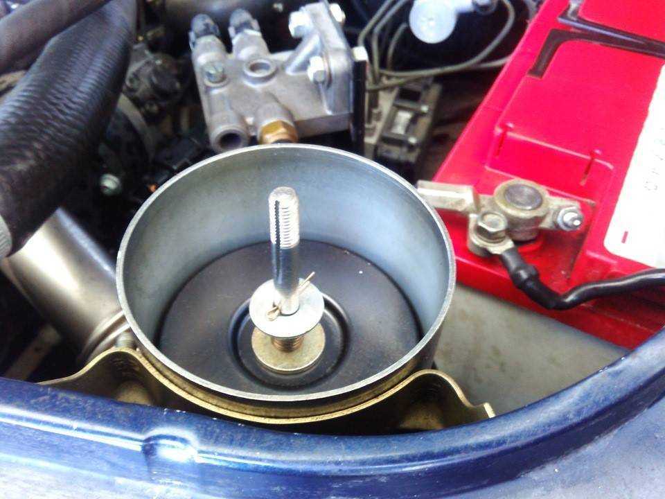 - С бачка снимается крышка и удаляется сетка фильтра. Основная масса жидкости сначала откачивается с помощью шприца или груши, а остатки сливаются через шланг. При этом руль до упора поворачивается в обе стороны.