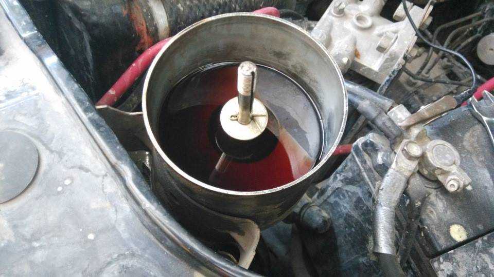 - Заливается свежая жидкость, пока ее уровень не поднимется над сеткой фильтра. Руль поворачивается от упора до упора, при этом должны выходить пузырьки воздуха. При необходимости жидкость доливается.
