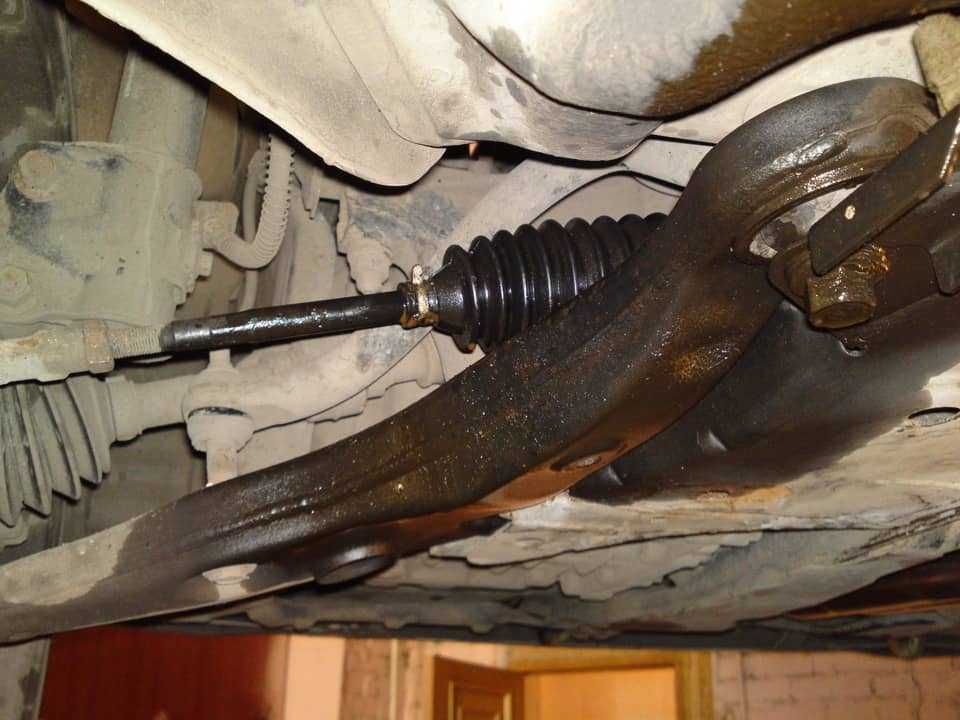 - Демонтируем рулевые тяги. Чтобы это сделать, надо левую сторону автомобиля приподнять домкратом и снимаем колесо. Обычно, чтобы снять тяги, надо использовать спецсъемник. Но, в данном случае сделать это можно без съемника.