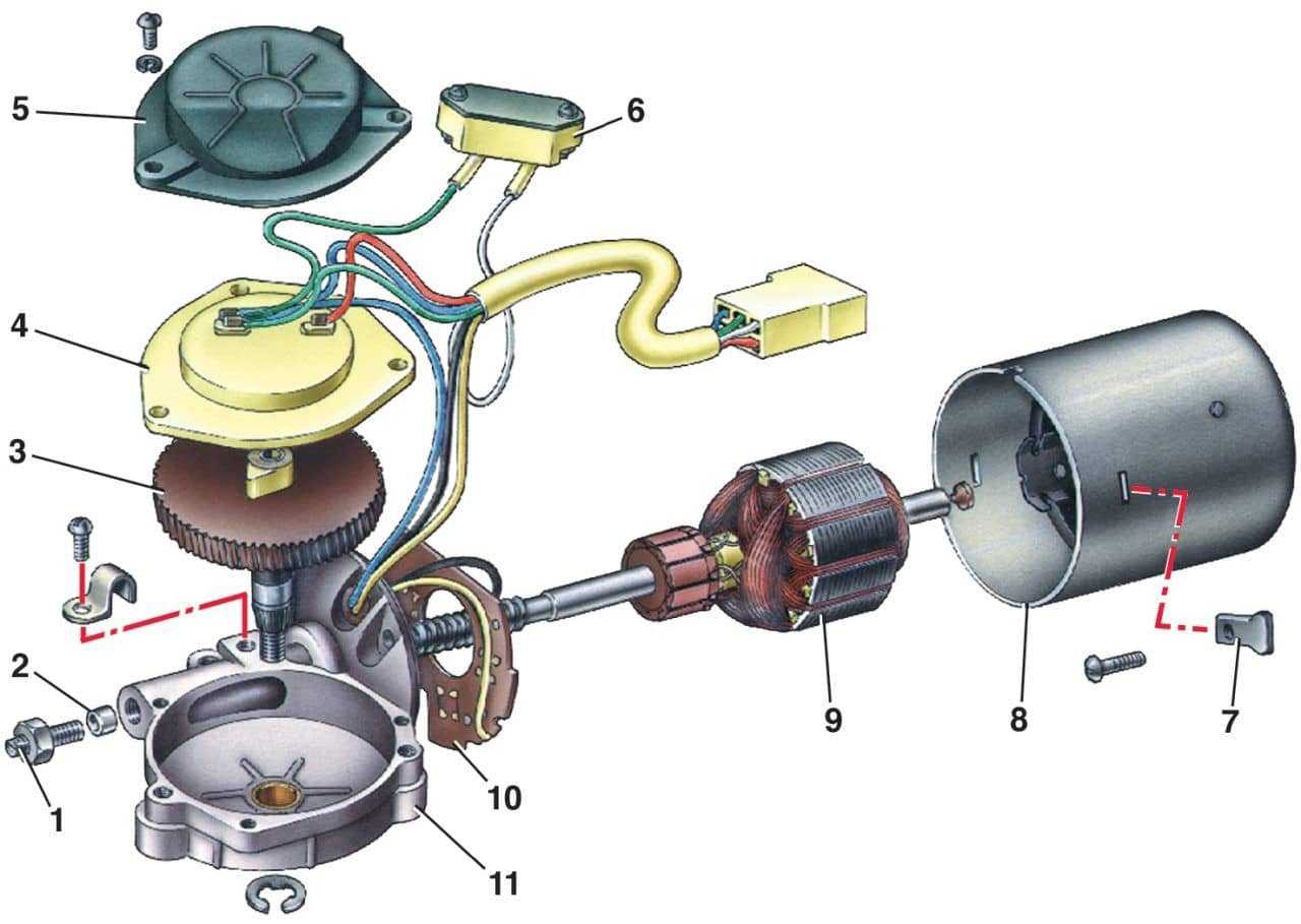 Важно! Для получения доступа к внутренностям моторедуктора необходимо снять весь привод стеклоочистителя. Осуществить последнее можно только после отсоединения контактных разъемов, демонтажа всех реле в блоке предохранителей, вентилятора печки, гаек, фиксирующих оси под щеткодержатели, болта кронштейна, крепящего электродвигатель к кузову