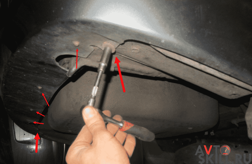 5. Далее в районе защиты двигателя откручиваем пять гаек на десять.