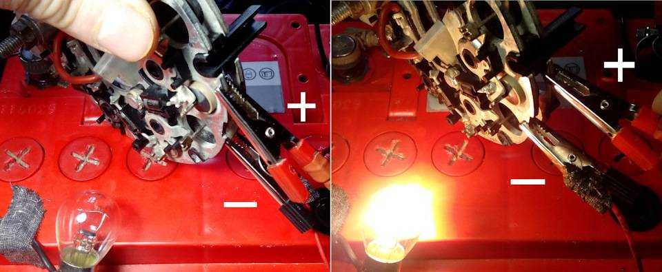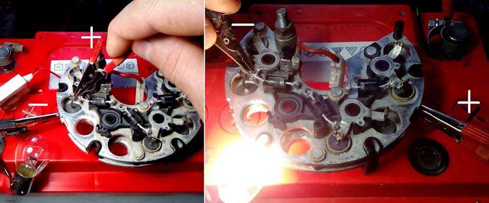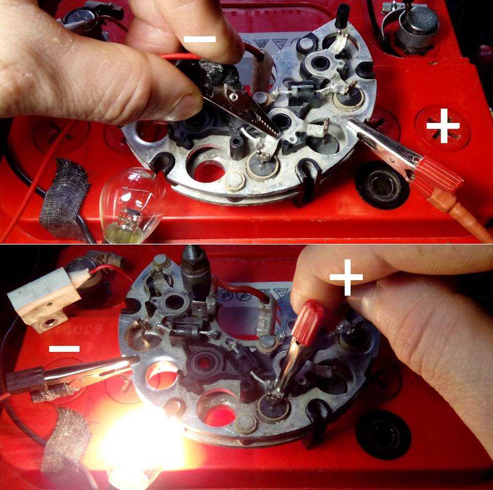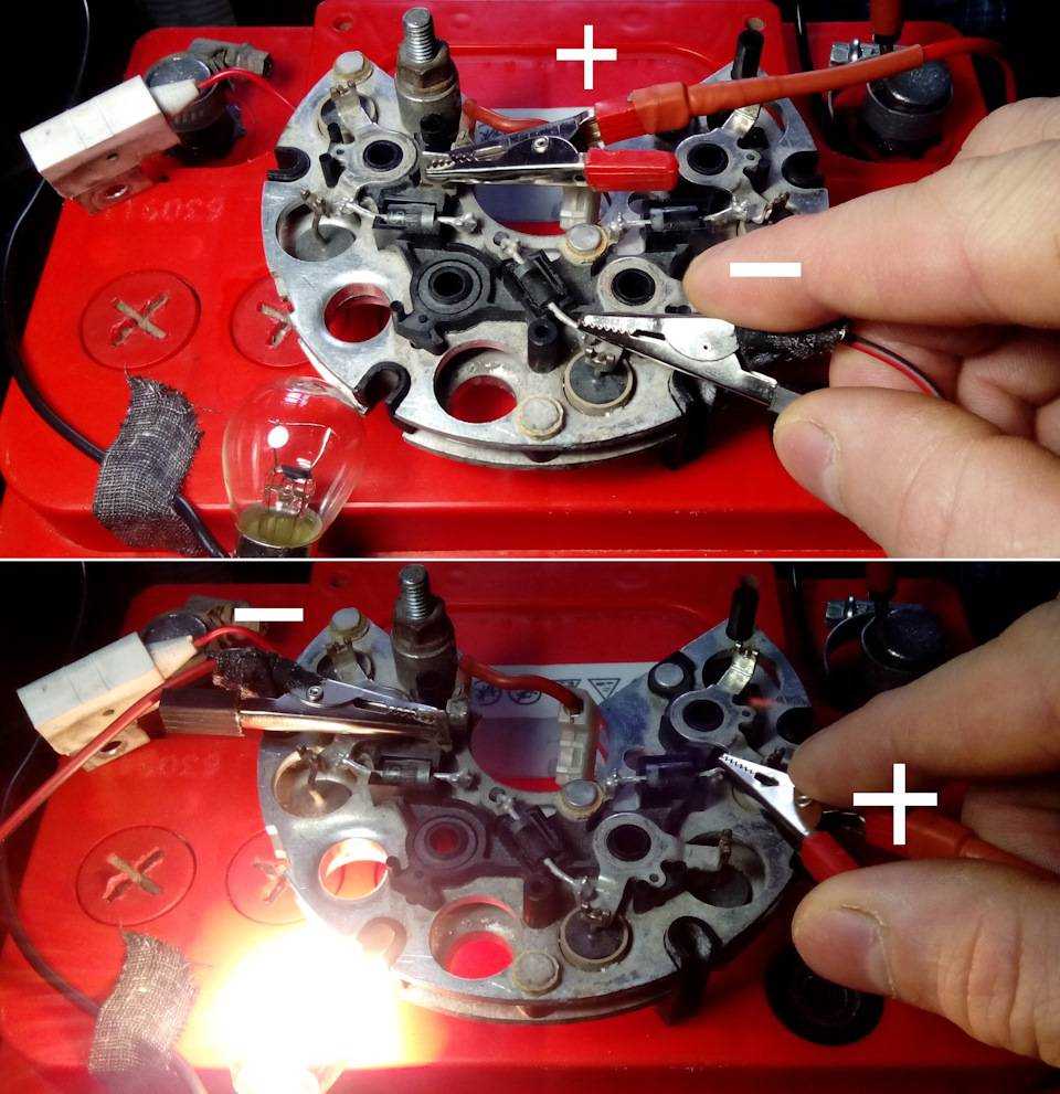 Поэтому, диоды следует проверять под нагрузкой, например, с помощью контрольной лампы в несколько ватт — чем больше, тем лучше. Для этого воспользуемся обычной автомобильной лампочкой 12В мощностью 21 Вт, источником тока послужит аккумуляторная батарея. К плюсовой «+» клемме последовательно подключаем лампу с плюсовым проводом, к минусовой «-» клемме минусовой провод. При замыкании проводов лампа загорается.