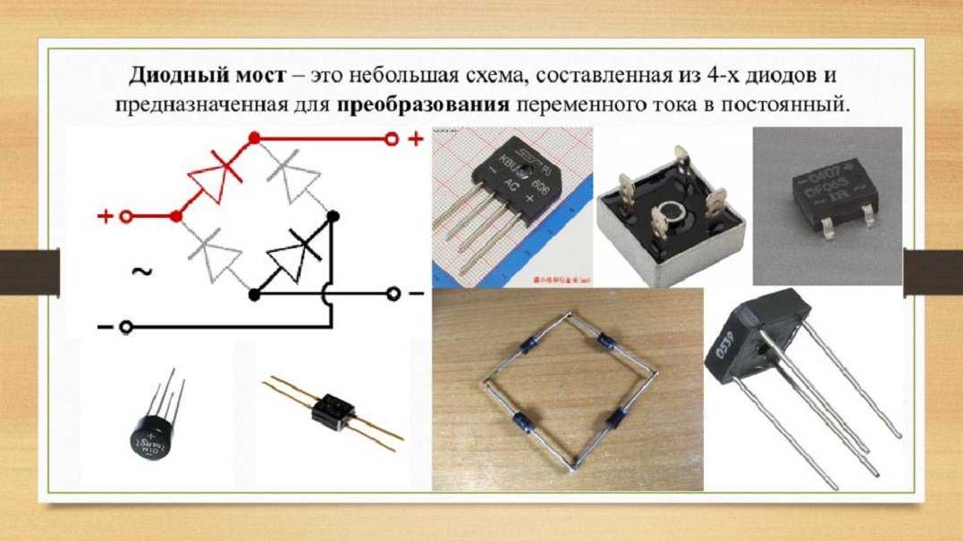 Вторым названием диодного моста является двухполупериодный выпрямитель. Он включает в себя полупроводниковые выпрямительные диоды или шотткины электродиоды. Элементы могут быть отдельно распаяны на плате. В современном варианте объединяются диоды в одном корпусе. Это называется диодной сборкой.