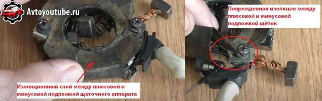 Но первым делом осматриваем щеточный узел. Между плюсовыми и минусовыми площадками должна быть надежная изоляция. Она может быть из картона или пластика. Если она нарушена, то будет замыкание между плюсовой и минусовой пластиной. Оно выведет из строя втягивающее реле, и стартер будет неработоспособный.