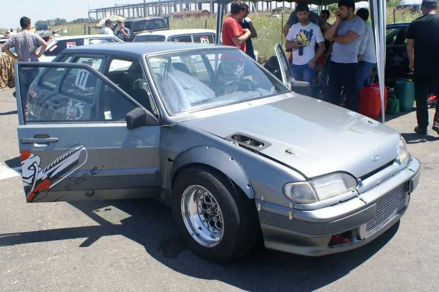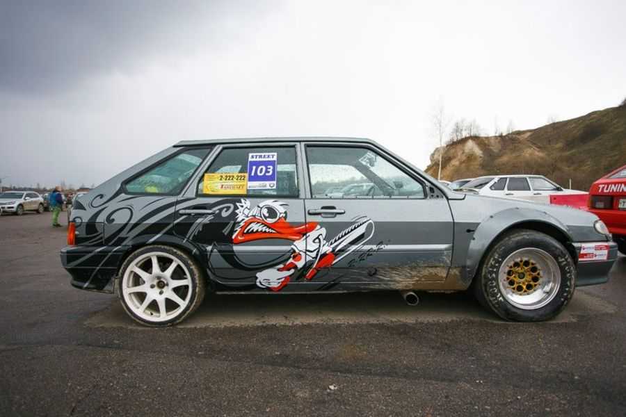 Второй спорт-вариант ВАЗ-2114 принадлежит команде из Воронежа и больше похож на оригинал внешне, чем предыдущий проект. Здесь больше кузовных деталей осталось от стокового автомобиля, хотя спереди под номером явно выделяется мощный интеркулер, большие накладные расширители арок и огромные сликовые колеса на передней оси.