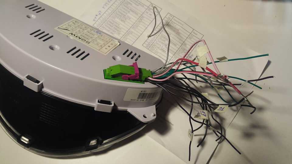 В приборных панелях с тахометром имеются некоторые отличия, которые могут вынудить вас сделать небольшое отверстие рядом под тросик спидометра, или же расширить старое при помощи напильника или любого другого абразива. После того, как отверстие готово, начинаем собирать контакты к новой панели. В данном случае распиновка может немного отличаться в зависимости от конкретной модификации и года выпуска, так что конкретно к вашему автомобилю информацию нужно искать в инструкции по эксплуатации.