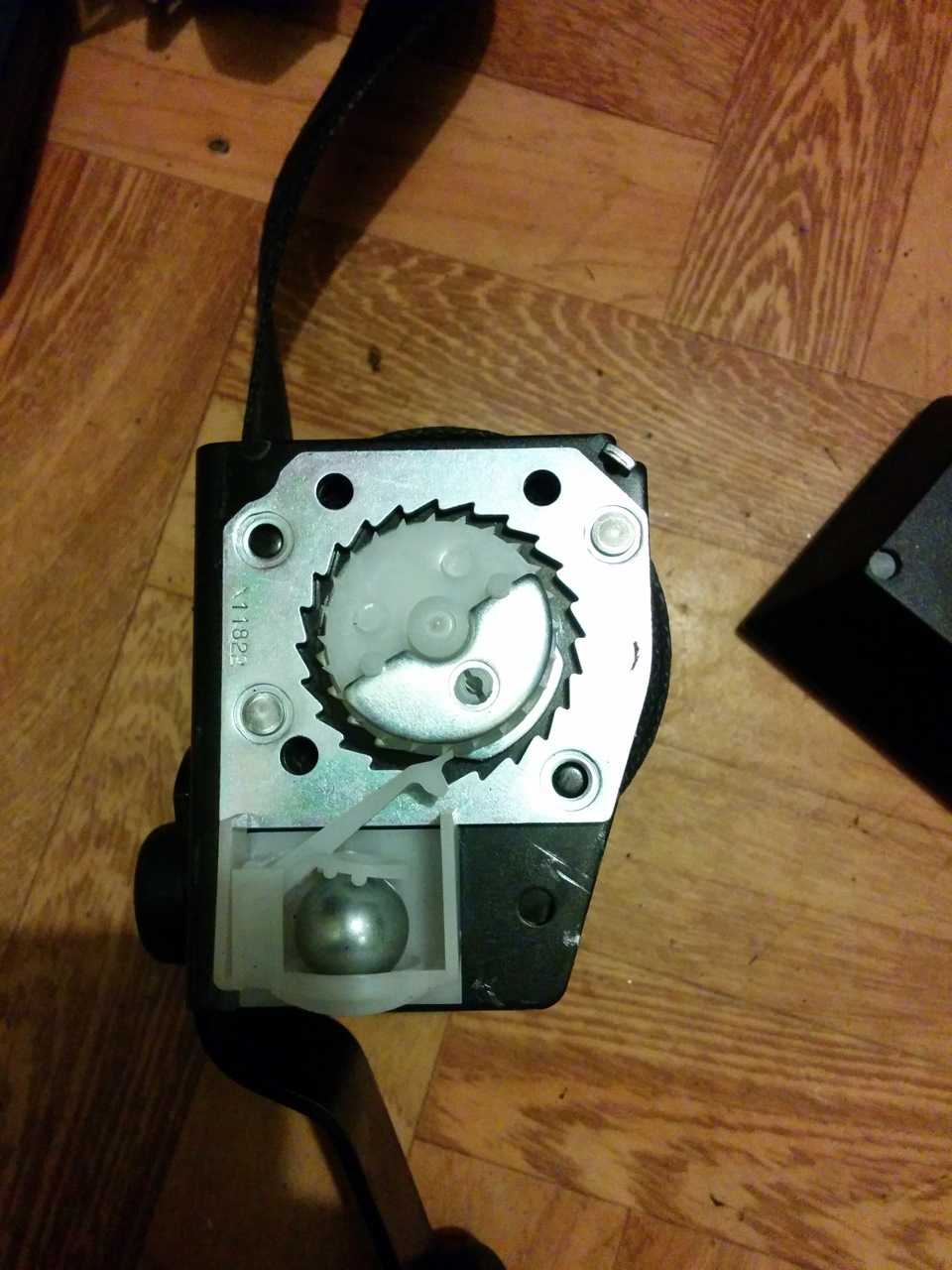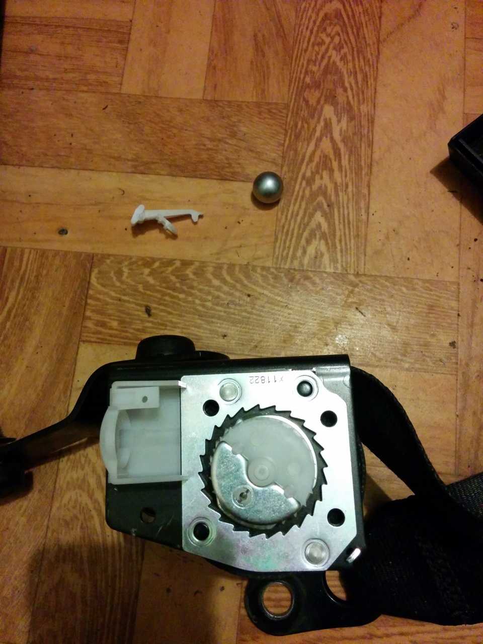 злополучная коробочка с шарикомВообщем исходя из всего увиденного, есть 3 пути решения этой проблемы: рассверлить посадочное место под шарик убрав его выпадение, убрать шарик совсем ( он перестанет клинить качельку, ремень станет свободным, блокировка не будет работать при резком дерганье), убрать качельку и шарик (ремень станет полностью свободным без стопорения).