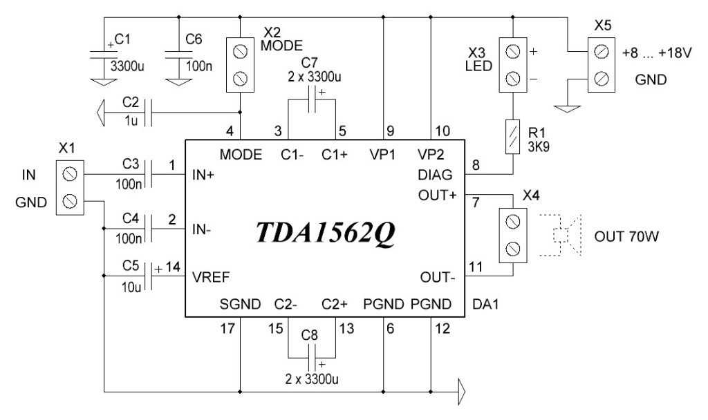 Микросхема TDA1562Q обладает также дополнительными клеммами Х3, которые можно при необходимости использовать в качестве индикатора аварийного состояния усилителя. Для этой цели достаточно к клеммам Х3 просто подключить светодиод.