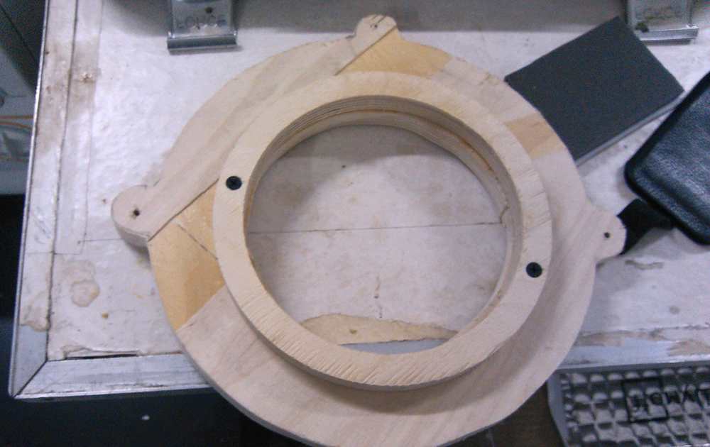 И так приступим. Я дома нашел кусок ненужной фанеры и вырезал при помощи электролобзика и дрели 4 кольца. Внутренний диаметр кольца — 110,5 мм: