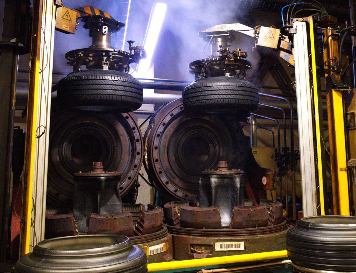 Ключевой момент в производственном процессе покрышки — вулканизация. Выражаясь простым языком, это процесс, когда заготовка помещается в пресс-печь, которая придает ей необходимую форму, запекает смесь при высокой температуре и делает на шине все необходимые штампы и надписи. Однако изъятая из печи резина все еще не является полноценной шиной — свою окончательную форму покрышка принимает во время остывания.