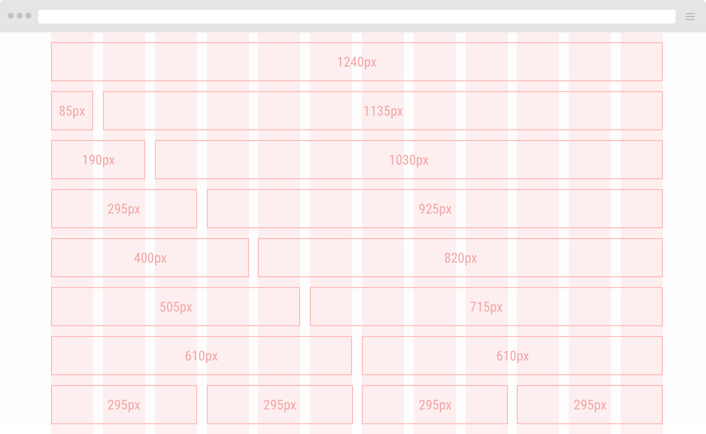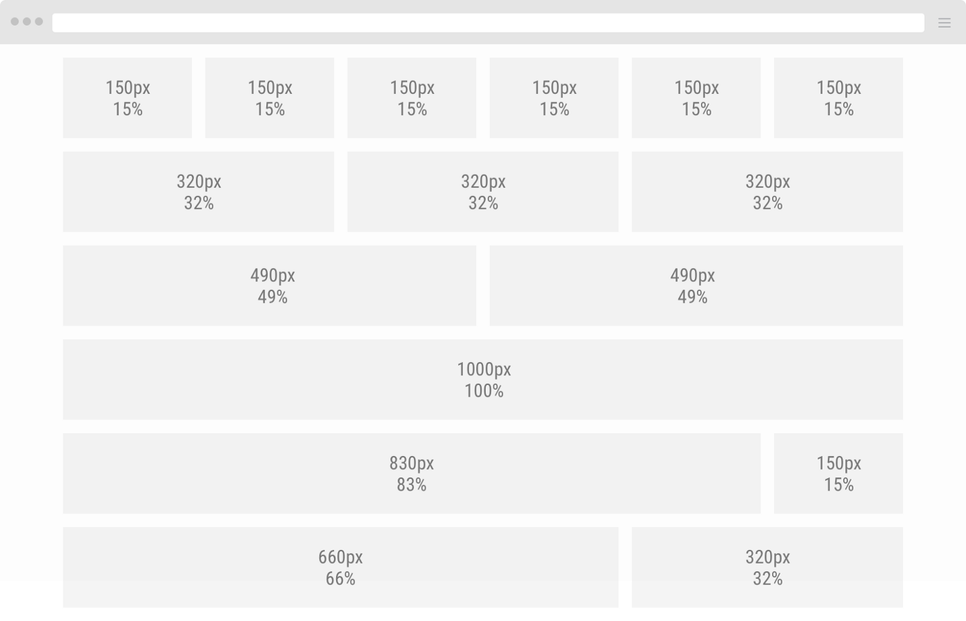В вебе также используется понятие Fluid Grid или «резиновая» сетка. Ее особенность в том, что расстояния для нее задаются не в пикселях, а в процентах. За 100% принимается область контента. Ниже упрощенный пример для ширины макета в 1000 пикселей с 6-ю колонками.