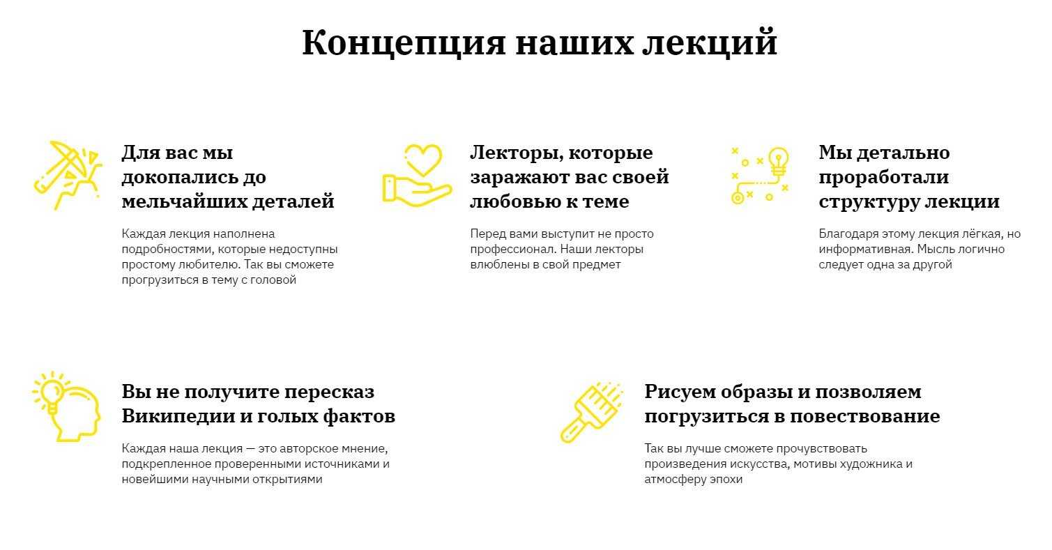 Теперь пройдёмся по сайтам. Вот блок с буллитами — списком текстовых элементов и иконок: