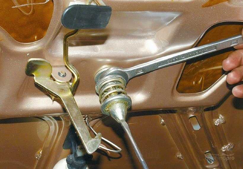 Проложив трос к защелке капота, отпускаем зажимной болт с помощью ключа, устанавливаем новый трос с чехлом и приступаем к регулировке. Для этого стоит закрыть защелку с помощью отвертки, имитируя капот и попытаться открыть защелку из салона. Если же ручка не срабатывает, то возле защелки подтягиваем трос, далее повторяем процедуру и так, пока процесс открытия не станет удобным и достаточно легким.