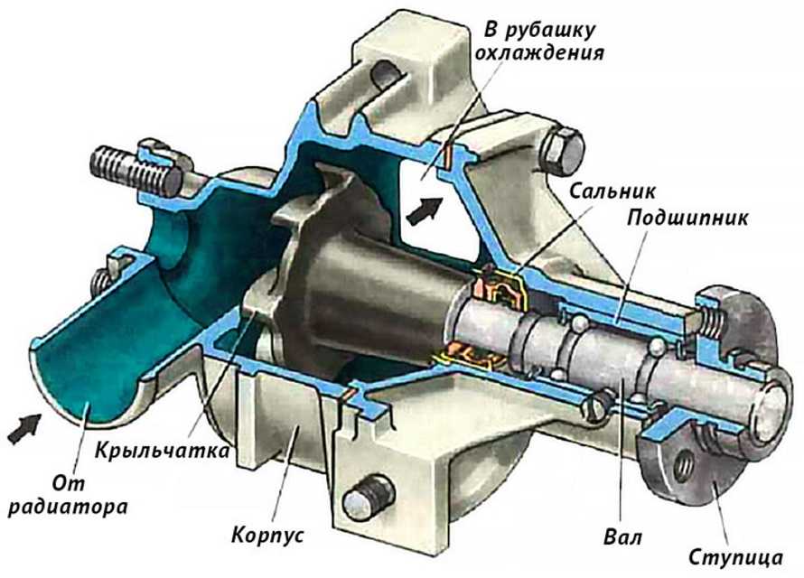 - Корпус – несущая металлическая конструкция сложной формы для размещения составных элементов, за исключением крыльчатки и шкива, а также его крепления на двигателе. Герметичность обеспечивается прокладкой. Оборудован двумя патрубками (напорный и всасывающий) для подключения к рубашке охлаждения и радиатору. В районе нахождения подшипников имеется дренажное отверстие для недопущения скапливания влаги.
