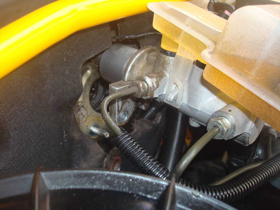 Как я говорил «Установка ЗДТ» , что после установки появился слишком большой свободный ход педали тормоза.После нескольких прокачек тормозов стало намного лучше, но все равно не так как хочется.Поэтому давно хотел сделать хитрость.Еще помню по бывшей машине(2106) там регулировал шток/толкатель ГТЦ.Собсно тоже самое попробовал и здесь.Откручивается ГТЦ, отгибается как можно дальше и без повреждения трубок: