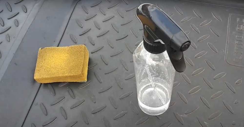 Далее, наносим раствор небольшими порциями на коврик. Лучше всего — с помощью простой хозяйственной губки. Промакиваем, как бы прокрашиваем резину. Много лить не стоит, потому что глицерин создаёт жирный слой. Можно, кстати, использовать флакон с пульверизатором: брызгать жидкость на коврик и тут же втирать её губкой.